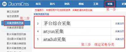 需要采集时,依次点击【采集】-【采集资源库列表】-茅台资源站具体操作如下图